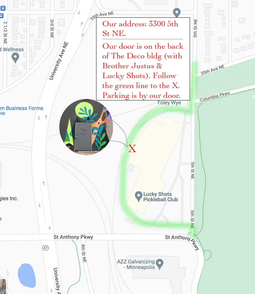Store address: 3300 5th St NE. Go to the back of the building to the door with the mural on it.