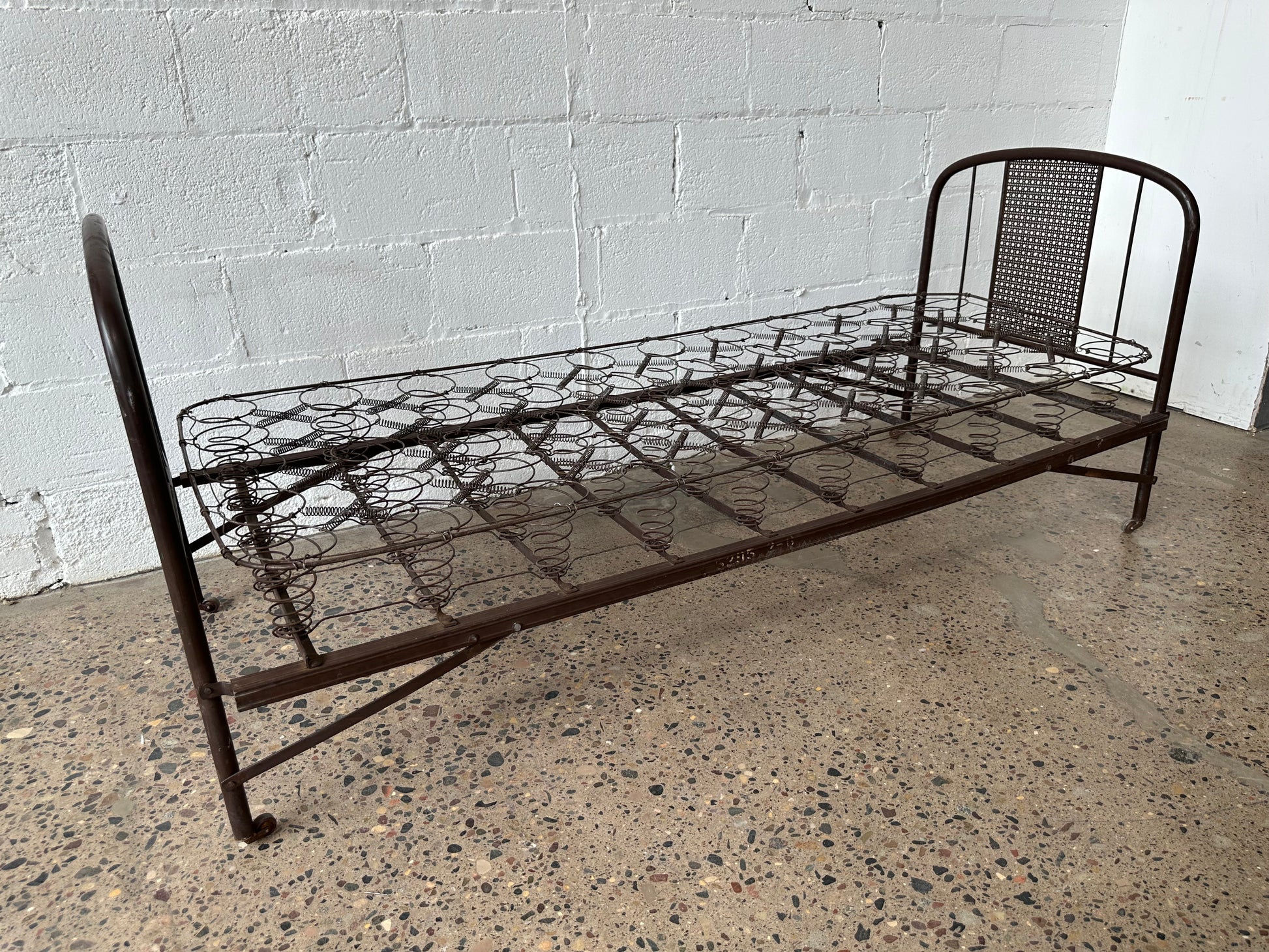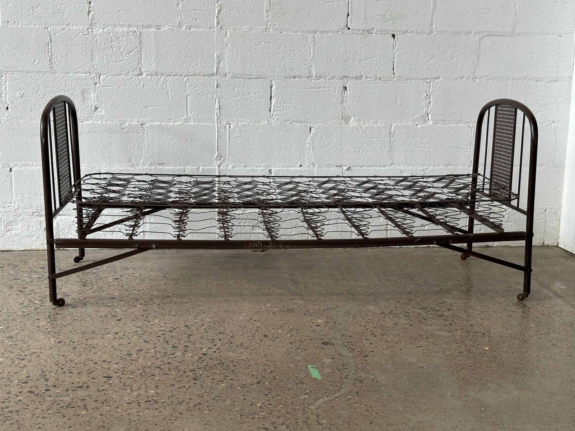 Antique metal bed frame with wire springs. The bed has casters that engage in it's unfolded position, however they are not large enough to move the bed if there's someone on it. They only work with an empty bed. The casters disengage when the bed is collapsed.