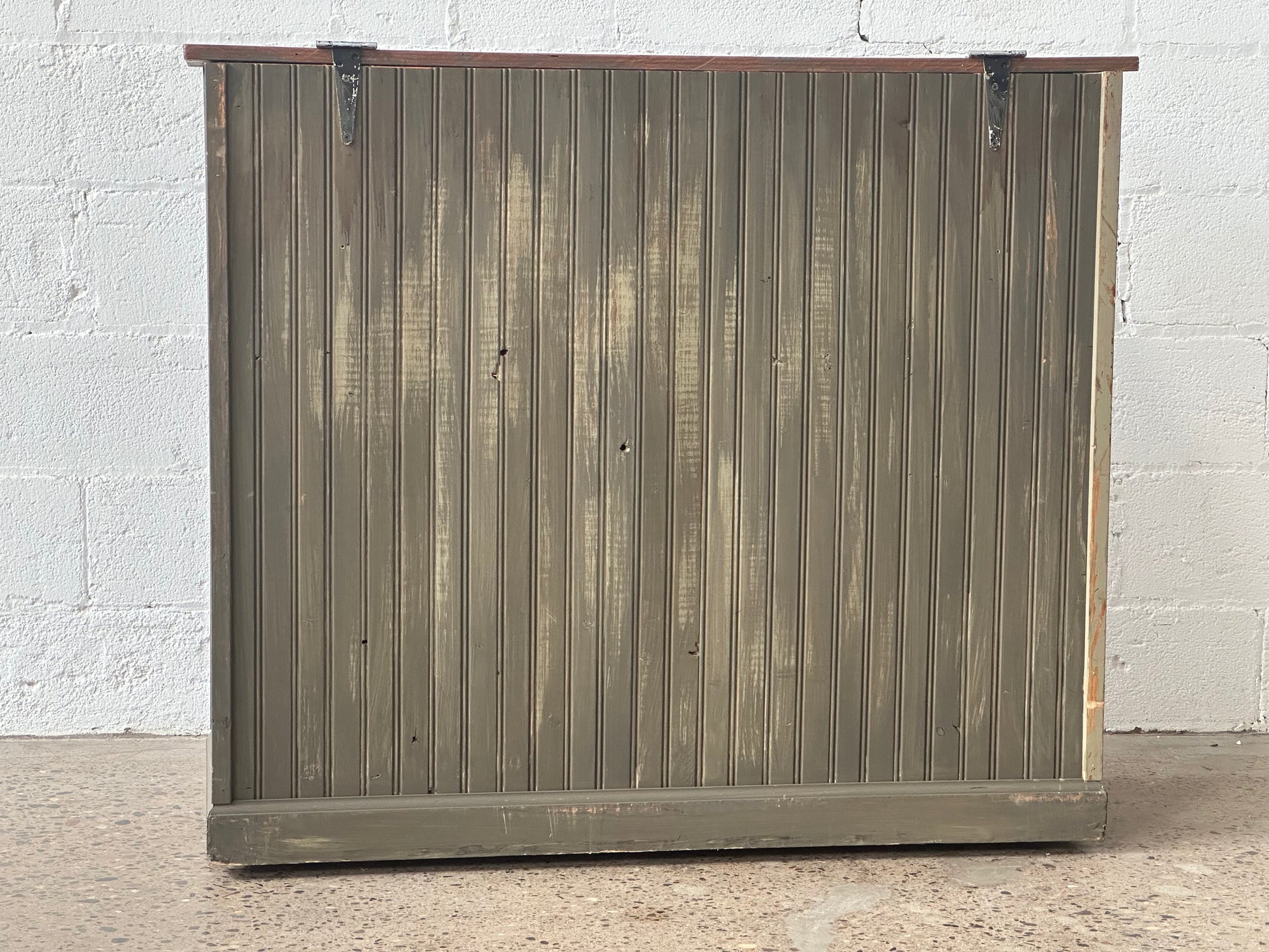 Rolling countertop that is double sided. The top also flips forward so you can put signs on the front of the counter and flip the top to reveal a second sign for a different location. This piece is paintable to fit with your show or design.