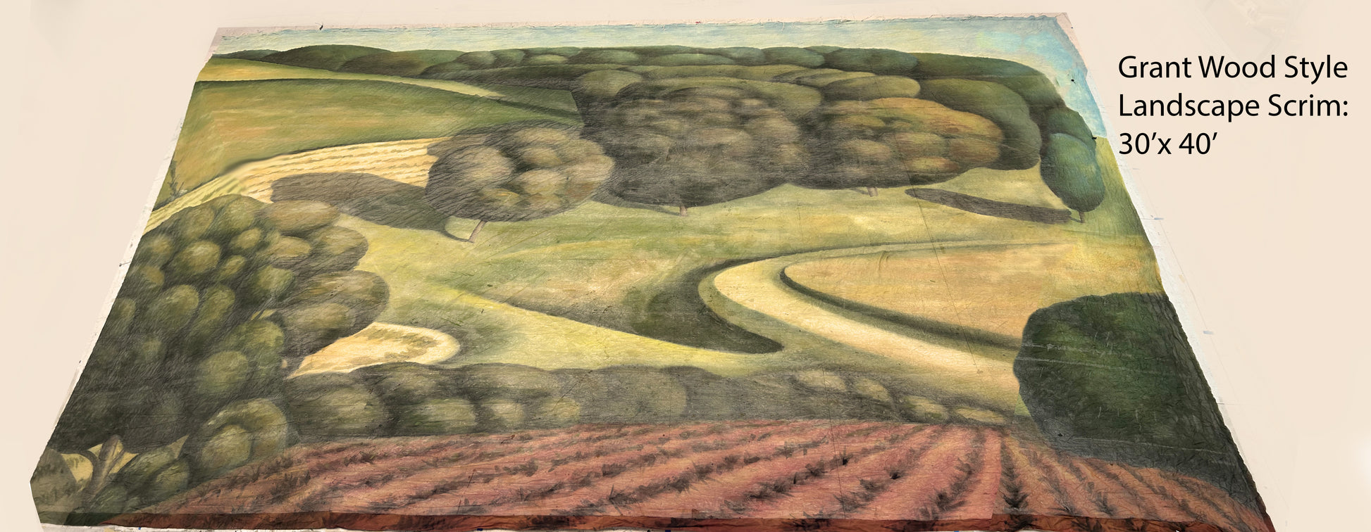 The midwestern landscape is painted on scrim, a theatrical gauze. It can be lit from the front or the back to create different effects on stage. It's painted in the style of Iowan painter Grant Wood. This backdrop is great for Music Man, Oklahoma, Wizard of Oz, and other classic musicals.