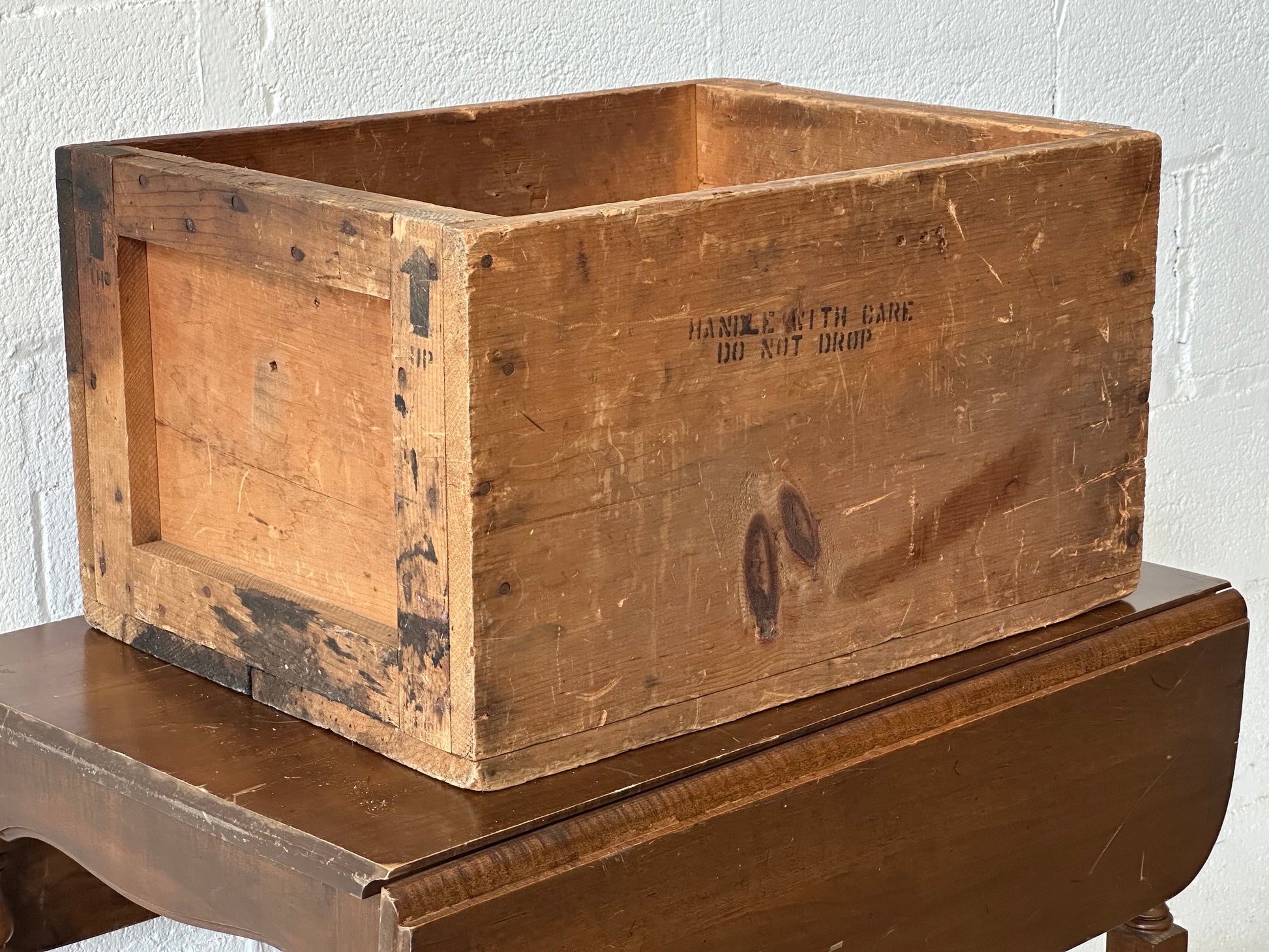 Rustic wooden crate with open top and a stamp that says "Handle with Care"
