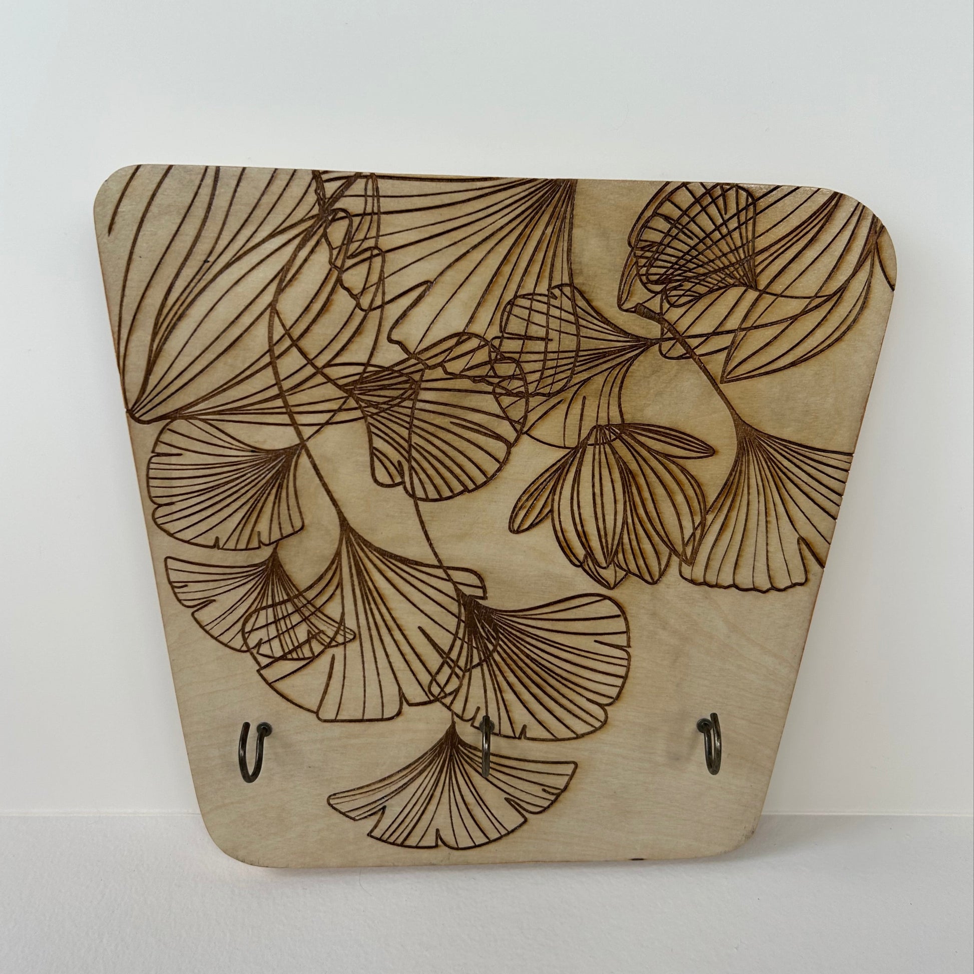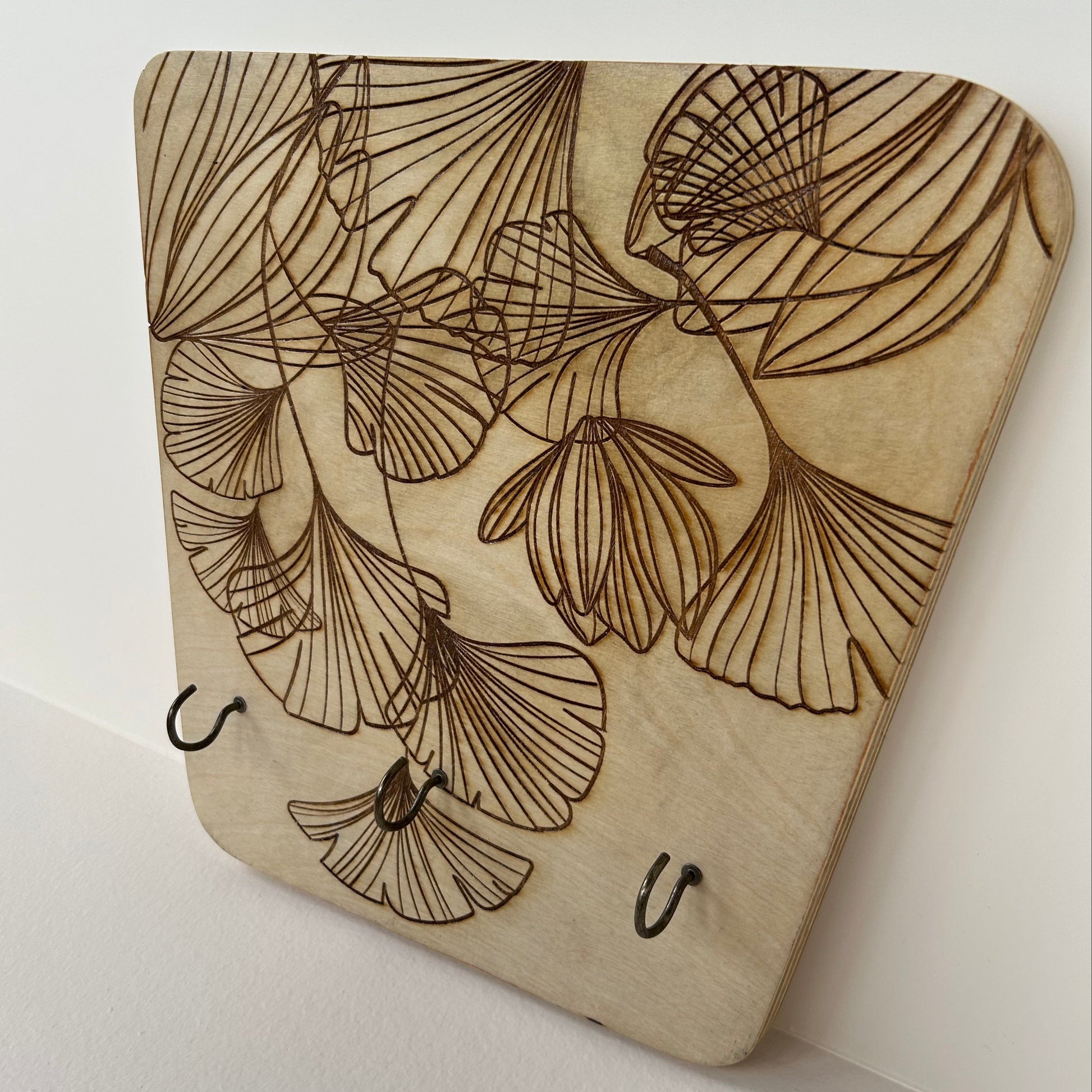 This beautiful jewelry/key organizer has a ginko leaf motif and is made from reclaimed plywood. The design is laser etched into the plywood, then sealed with poly.