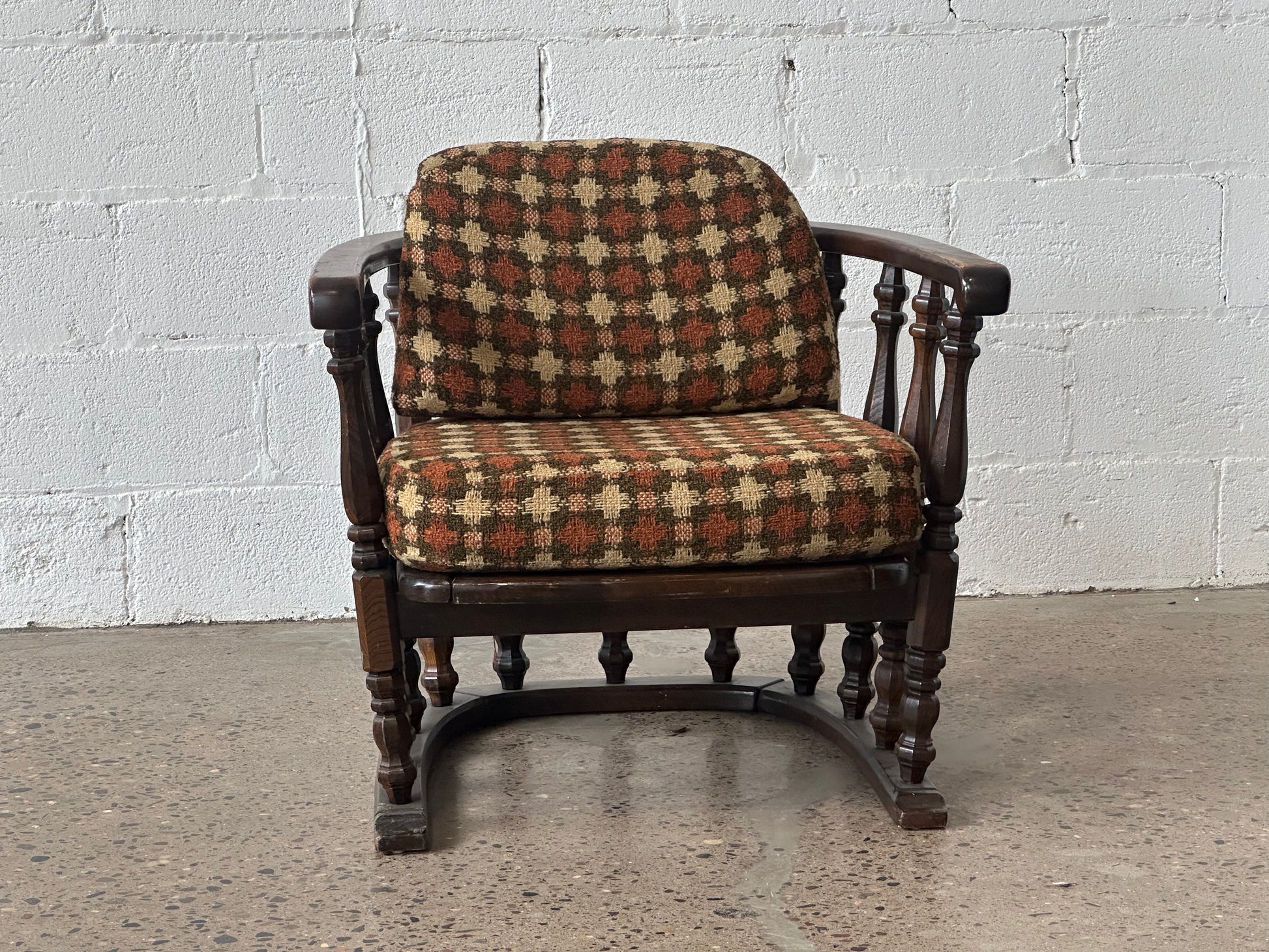 Barrel framed, orange plaid upholstered armchair. This one is ready for any cabin, rustic or basement location. We fondly call this "the Grandpa chair".