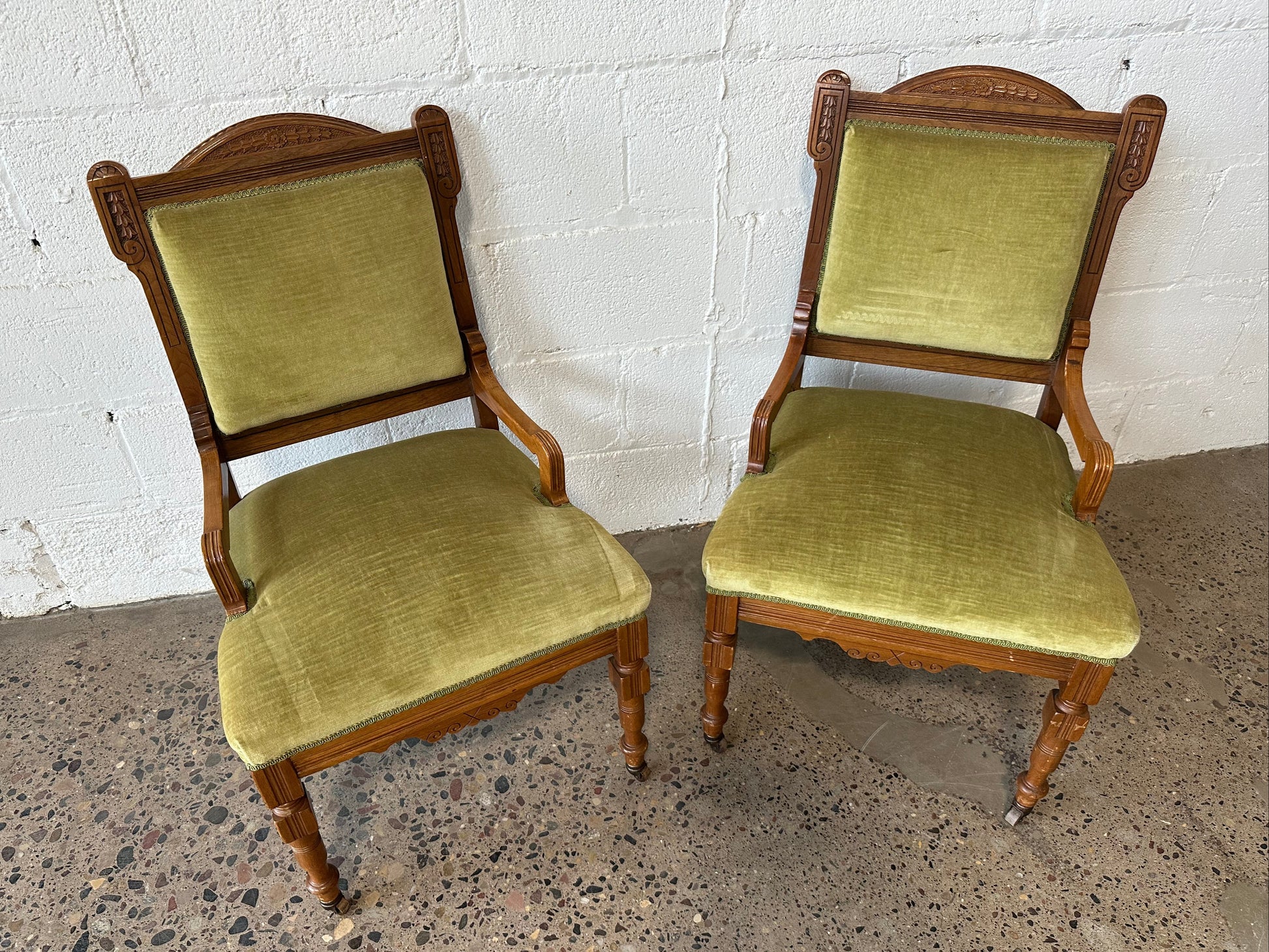 Pair of matching wooden chairs with carved early 1900s details and pistachio colored upholstery. Original antique chair casters intact.