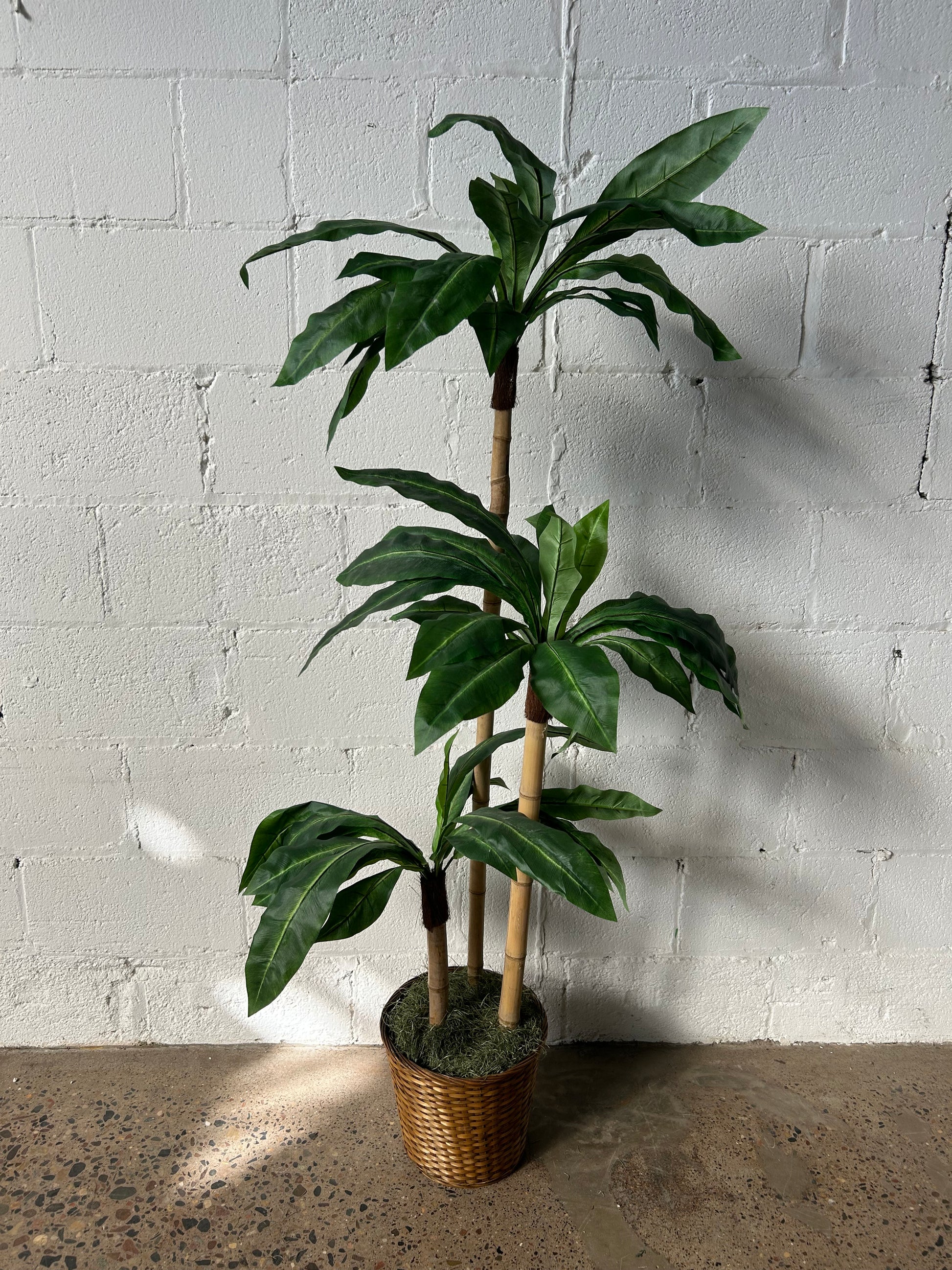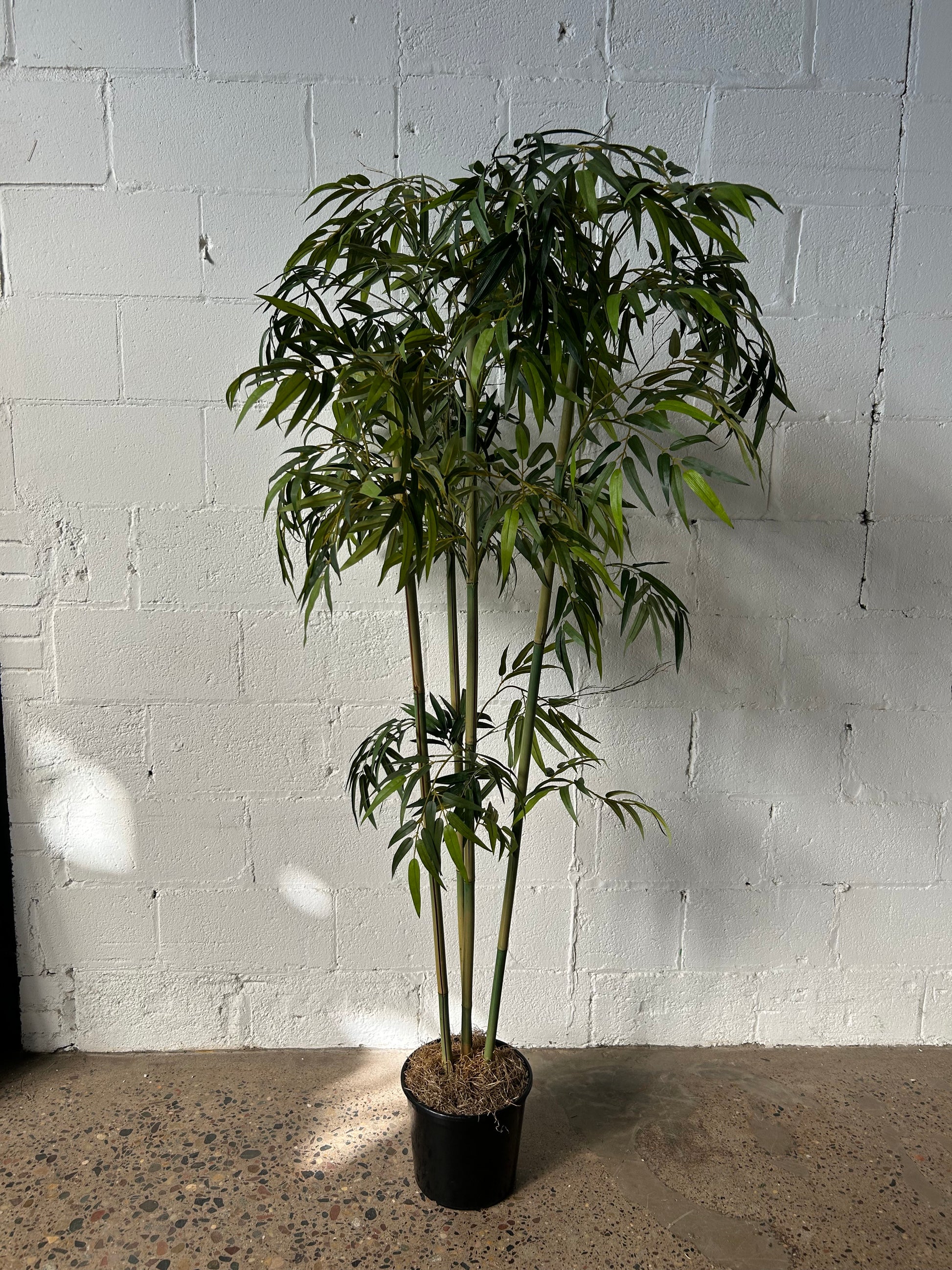 Various species of fake potted palm trees, bamboo, and other tropical plants.