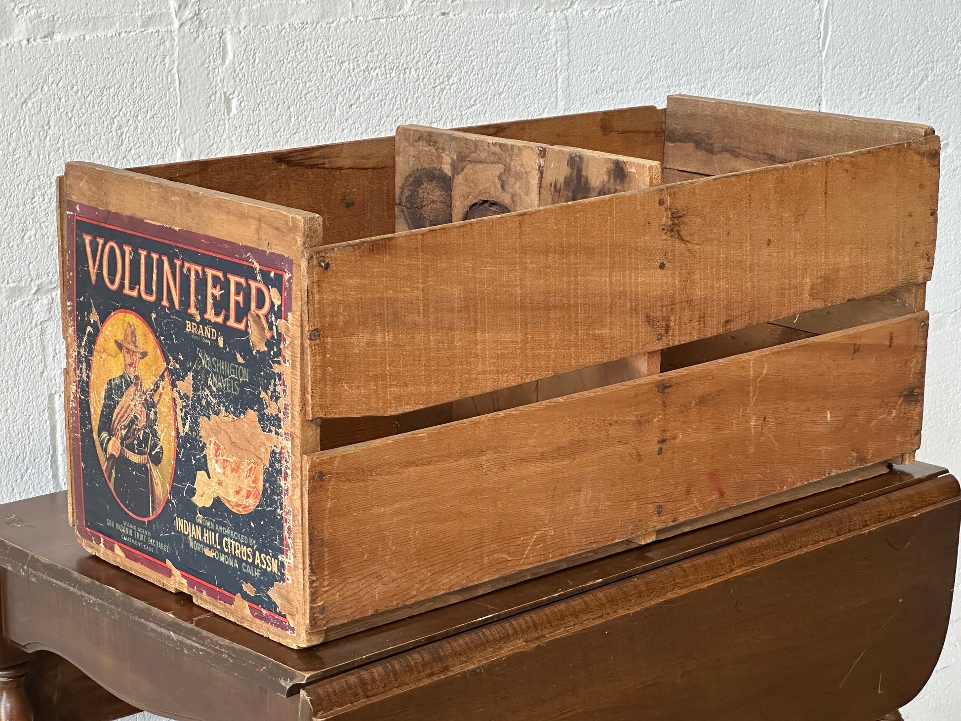 Open slat fruit or veggie crate with label that says Volunteer Brand on it.