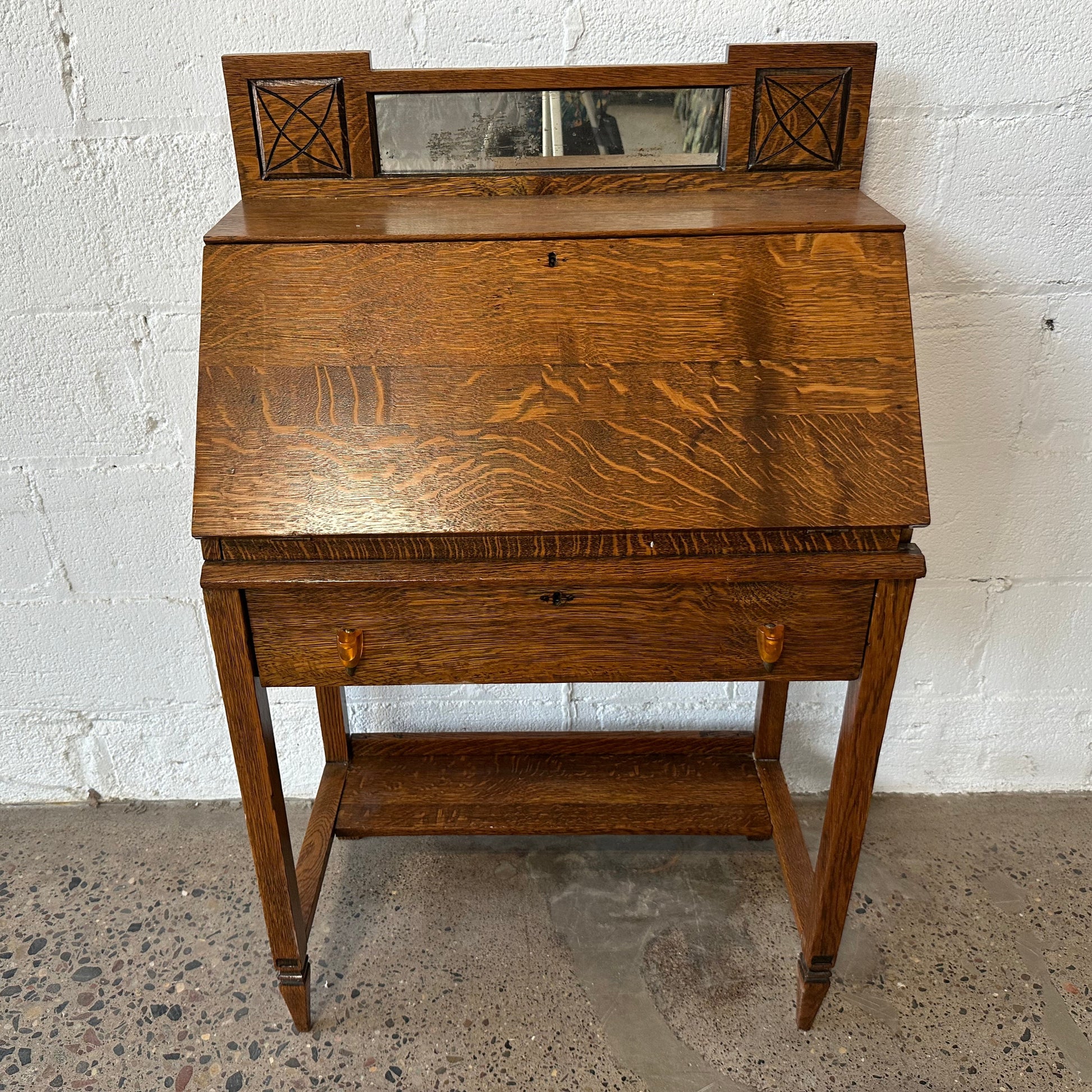 Turn of the century writing desk with tiger wood and a mirror detail.